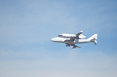 Yup, that's Endeavor riding piggy back on top of a 747 on its way around the Southland before landing at LAX.   I think I upset Destructo Boy a little when I grabbed him away from his lunch to go run outside to look for it since it just passed by Disneyland and I knew it was on its way to flyover us.  Our neighbor and I chatted for a minute before whe burst out "There it is!"  and we ended up running out in the middle of our residential street to get a nice unobstructed view.  It was amazingly close, following a street only 3 blocks away from us.